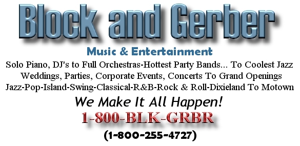 Solo Piano Artistry  *  DJ's  *  Orchestras  *  Weddings  *  Corporate Events  *  Concerts  *  Grand Openings  *  Jazz  *  Pop  *  Island  *  Swing  *  Classical Ensembles  *  R & B  *  Calypso  *  Events  *  Fundraisers  *  Casino Nights  *  Municipal Events * Communions  *  Christenings  *  Baby Namings  *  Rock & Roll  *  Reggae  *  Simchas *  Acappellas  *  Dixieland  *  Motown  *  Steel Drum Bands  *  Klezmer  *  Giveaways  *  Light Shows  *  Solo Guitar  *  Karaoke  *  Bat/Bar Mitzvahs  *  Brithdays  *  One Man Bands  *  House Parties  *  Dinner Dances  *  Political Events * Country Clubs  *  Retirements  *  Sweet Sixteens  *  Proms  *  Anniversary Parties  *  The Broadcaster's Hall Of Fame  *   Gala's  *   We've Been Making Parties TRULY SPECIAL For EVERYONE From Queen Elizabeth, Prince Philip, Charles & Diana, and King Constantine of Greece in London, To The NY Mets 86 World Series Victory Party - From Fox TV, The Today Show,  ESPN Awards, Donald Trump, To Performing For The Presidents Of The United States! - And Soon - Hopefully - For YOU!!!   *From The Coolest Jazz Groups To The Hottest Party Bands...Since 1983...WE MAKE IT ALL HAPPEN!!!....
